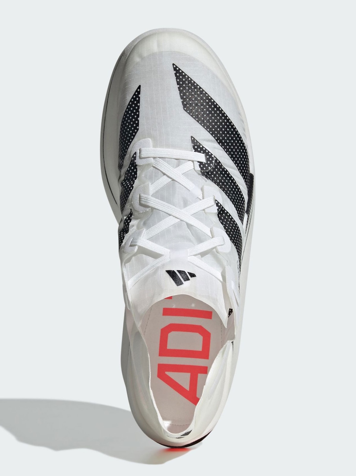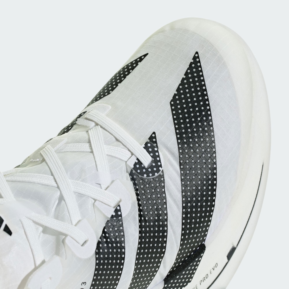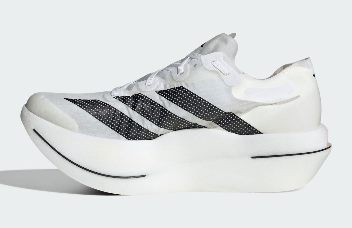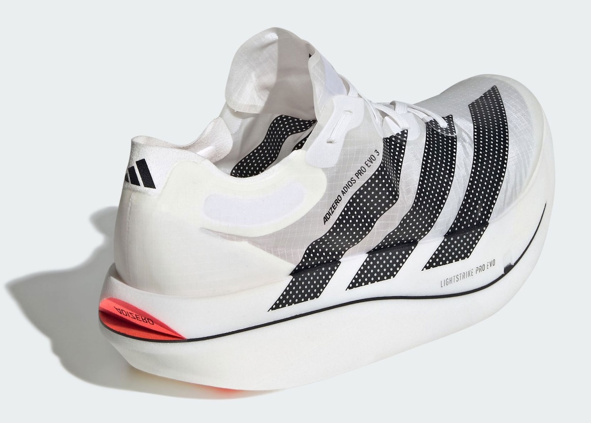 カラーリングはミニマルなCloud Whiteのアッパーに、Core Blackのスリーストライプスを大胆に配置。Solar Turboのアクセントがヒール周辺にわずかに効いています。前作Evo 2のデザイン言語を引き継ぎながら、より洗練されたプロポーションに仕上がっており、レースシューズでありながら視覚的なインパクトを持つ一足となっています。
