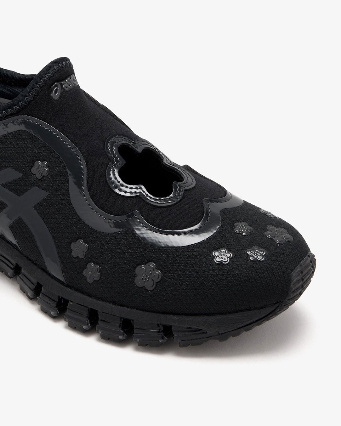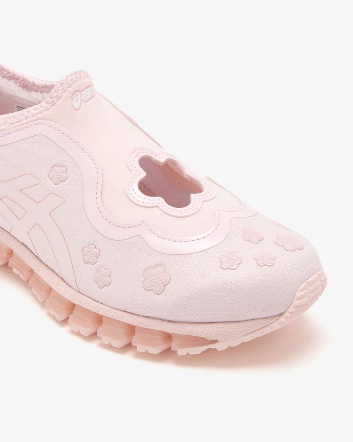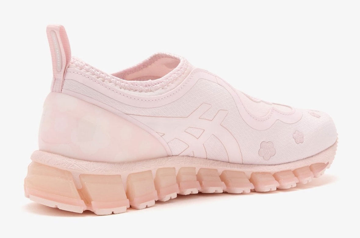 トゥキャップやサイドパネル、ヒール周りにもフローラルのエンボスメントが散りばめられ、装飾的でありながらクリーンな印象に仕上がっている。アッパーにはリップストップファブリックが使用され、ASICSストライプもトーナルカラーで配置。主張しすぎず、全体の調和を保つ設計となっています。