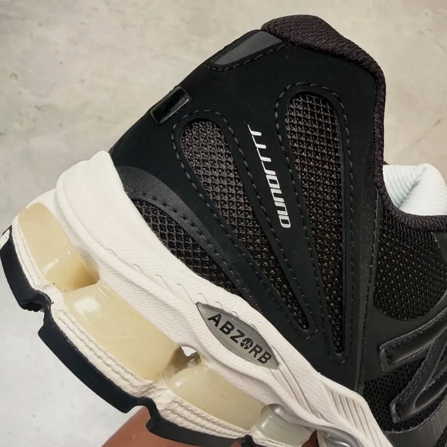 唯一のコントラストとなるのがホワイトのシュータンとシューレース。ここだけトーンを切り替えることで、フルブラックの重さを回避しつつ、視線の抜けどころを作っています。足元に目を移すと、ミッドソールはホワイトからクリームへとわずかに振れたトーンで、経年変化を思わせるニュアンスをプラス。ABZORBのブランディング部分とアーチ下のStability Web、そしてヒールのJJJOUNDのテキストロゴにはシルバーが入り、テクノロジーとブランドをさりげなく主張しています。