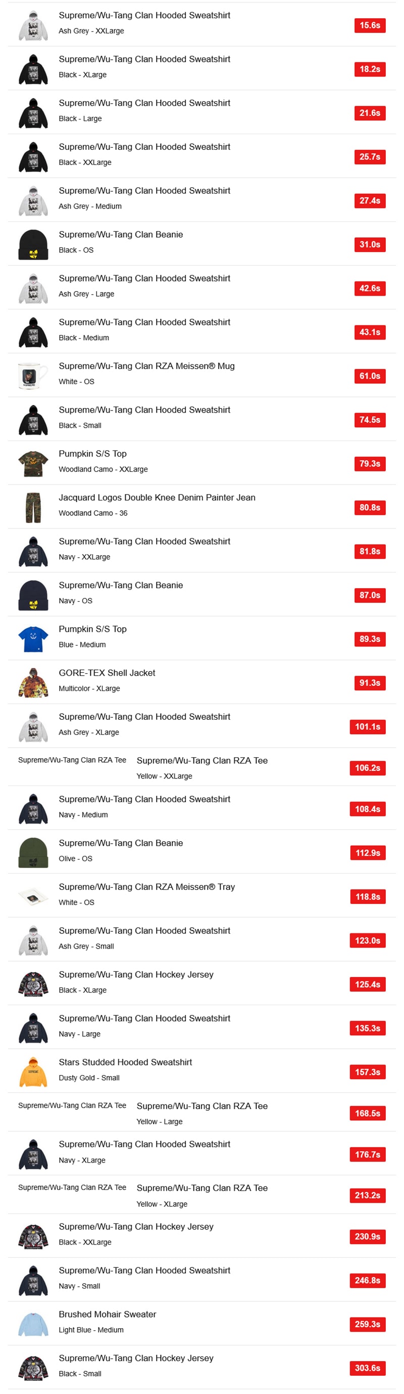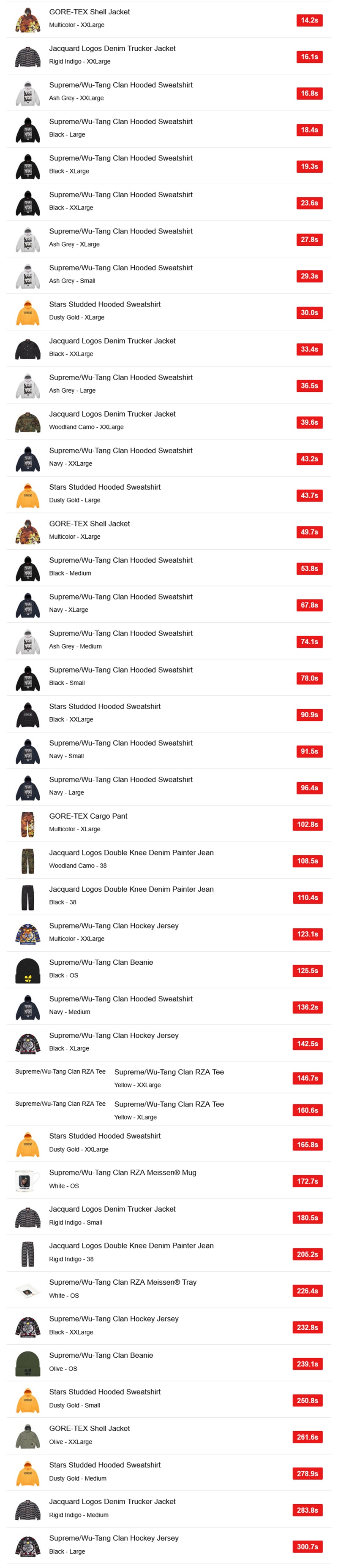EUではウータン・クランコラボのシェルジャケット「GORE-TEX Shell Jacket」とフーディー「Supreme/Wu-Tang Clan Hooded Sweatshirt」の人気が高かった模様。