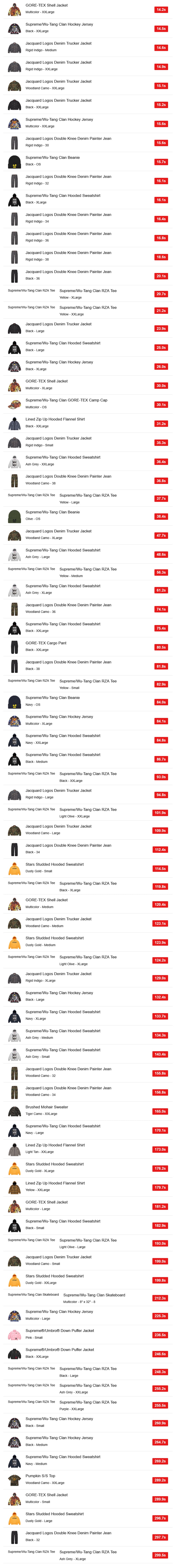 USではウータン・クランコラボのシェルジャケット「GORE-TEX Shell Jacket」、ホッケージャージ「Supreme/Wu-Tang Clan Hockey Jersey」、フーディー「Supreme/Wu-Tang Clan Hooded Sweatshirt」、レギュラーアイテムのトラッカージャケット「Jacquard Logos Denim Trucker Jacket」、ペインターパンツ「Jacquard Logos Double Knee Denim Painter Jean」などが人気だったようです。