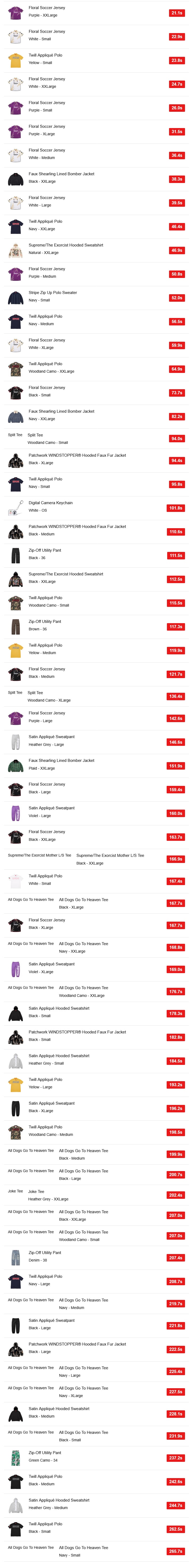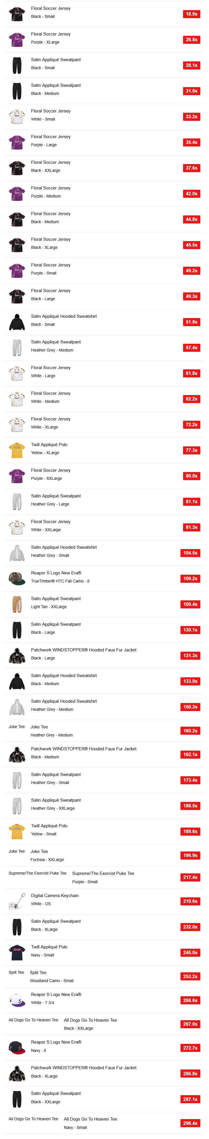 UKではUS、EUと同じく花柄が特徴的なサッカーシャツ「Floral Soccer Jersey」を筆頭に、Supremeのアップリケロゴがインパクトのあるフーディー「Satin Appliqué Hooded Sweatshirt」とパンツ「Satin Appliqué Hooded Sweatshirt」が目立つ結果になったようです。