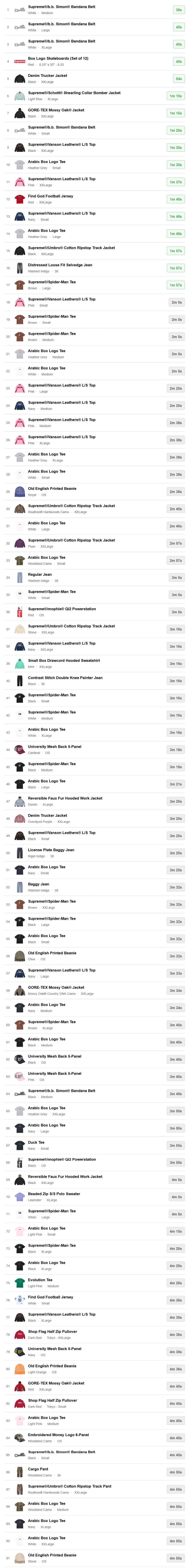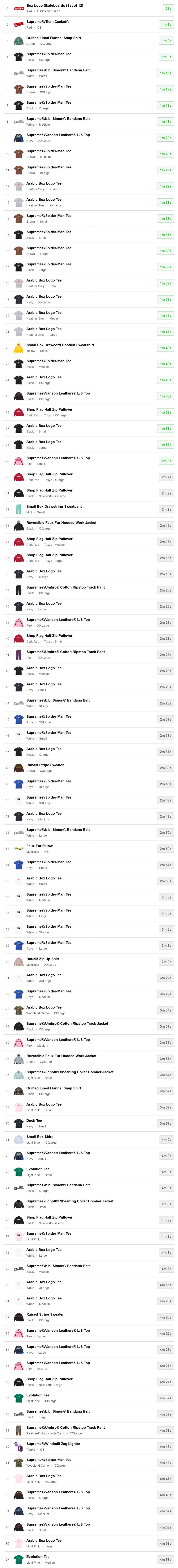 USでは12枚セットのスケートデッキ「Box Logo SKateboards」、b.b.サイモンコラボのベルト「Supreme®/b.b. Simon® Bandana Belt」、スパイダーマンのTシャツ「Supreme®/Spider-Man Tee」、アラビックフォントのボックスロゴTシャツ「Arabic Box Logo Tee」の人気が高かったようです。