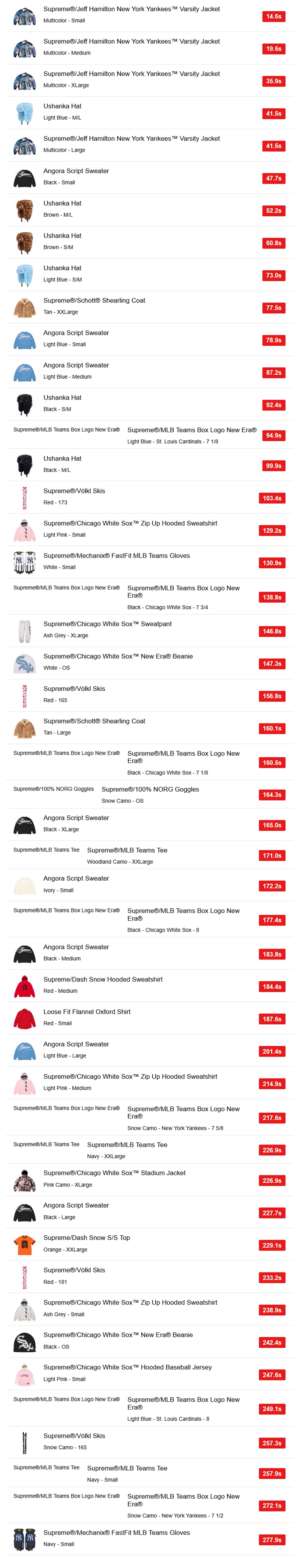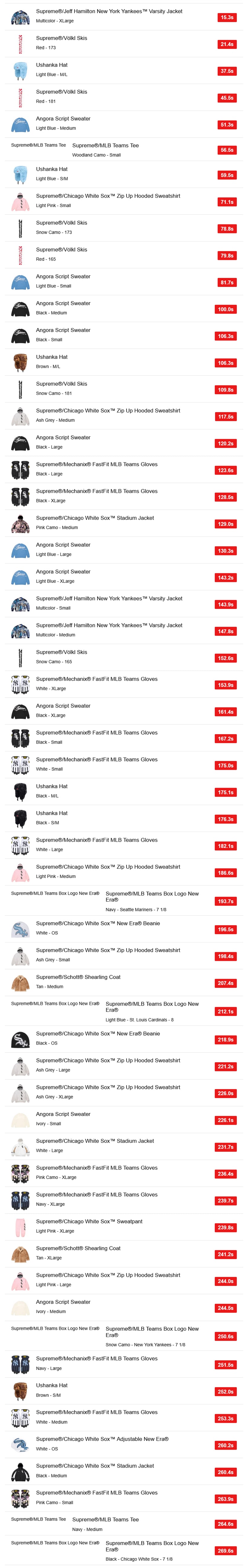 EUではUKではJeff Hamiltonコラボのバーシティジャケット「Supreme®/Jeff Hamilton New York Yankees™ Varsity Jacket」、スクリプトロゴのセーター「Angora Script Sweater」、ハット「Ushanka Hat」のライトブルー、スキー板「Supreme®/Völkl Skis」などの人気が高かったようです。