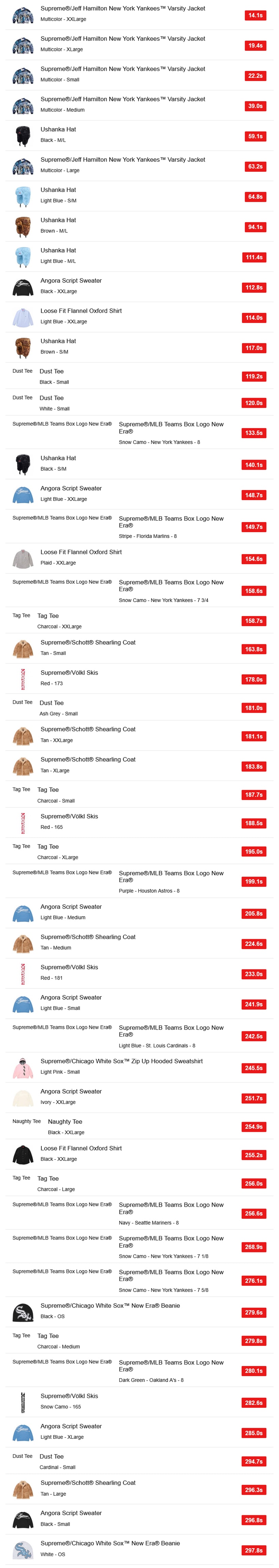 海外ではJeff Hamiltonコラボのバーシティジャケット「Supreme®/Jeff Hamilton New York Yankees™ Varsity Jacket」、スクリプトロゴのセーター「Angora Script Sweater」、ハット「Ushanka Hat」などの人気が高かったようです。